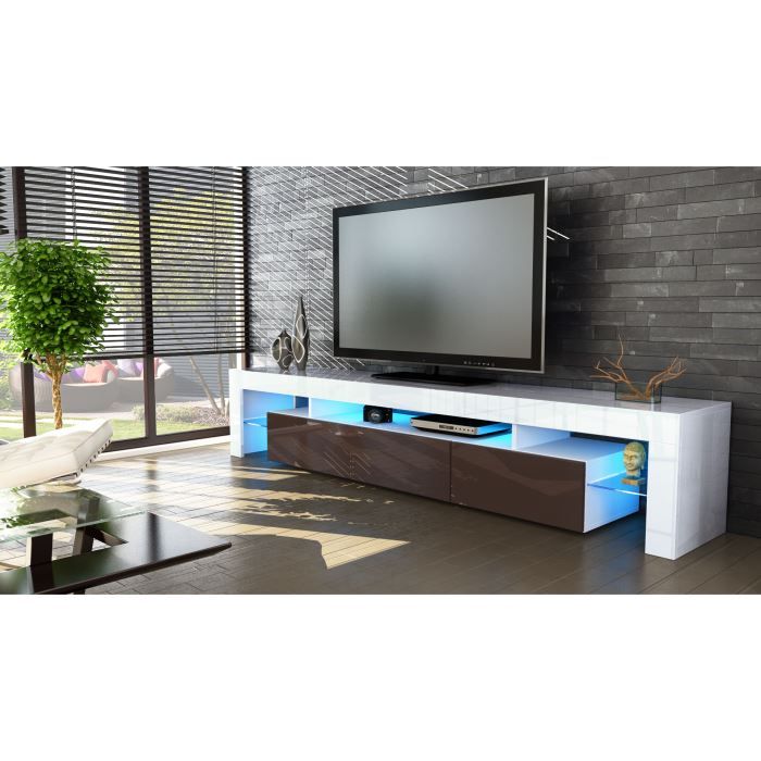 Meuble TV design lumineux 1.89 m chocolat et taupe SYMBIOSIS, aspect technique : Poids du colis : 76 kg Dimensions : L189xl60xH36 cm Matiere structure. Tati, les plus bas prix ! Meuble TV Blanc et Chocolat Haute Brillance , , Les Plus Produit :, Design contemporain et fonctionnel, 4 niches ouvertes a l.avant et a l. Meuble TV Ultimate Serie Exclusive Chocolat Laque, 5 compartiments, Range Ipad et Iphone, Range CD et DVD, Poids TV max 75 kg, (LxPxH):180x44x42.5cm.